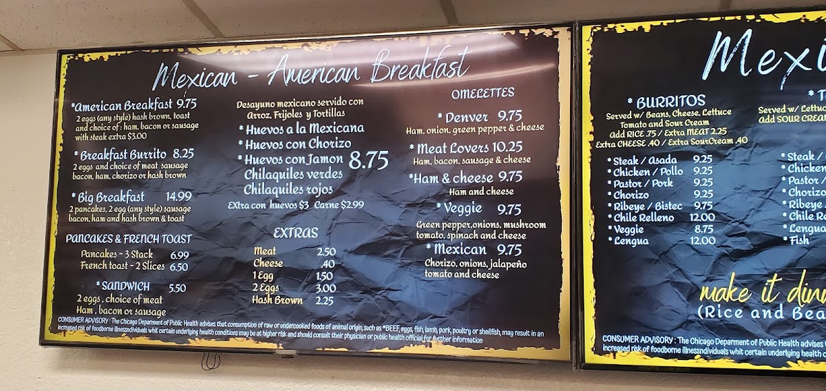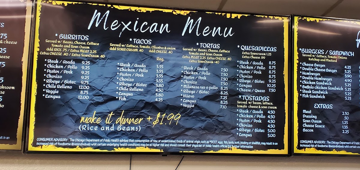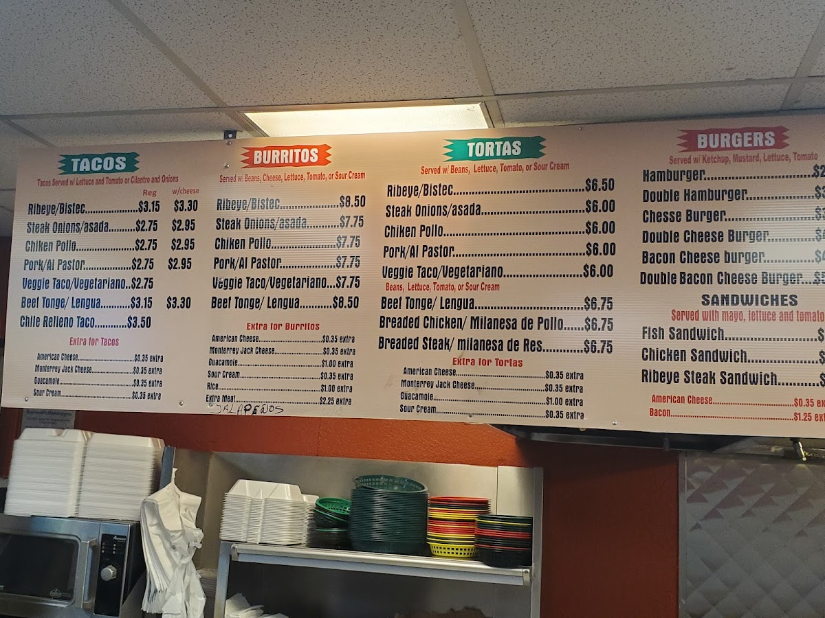 Choose a meat: Asada, Chicken, Pork, Ribeye: $1.50. Would you like to add extas?: Lettuce, Tomato, Cilantro, Onions, Cheese.